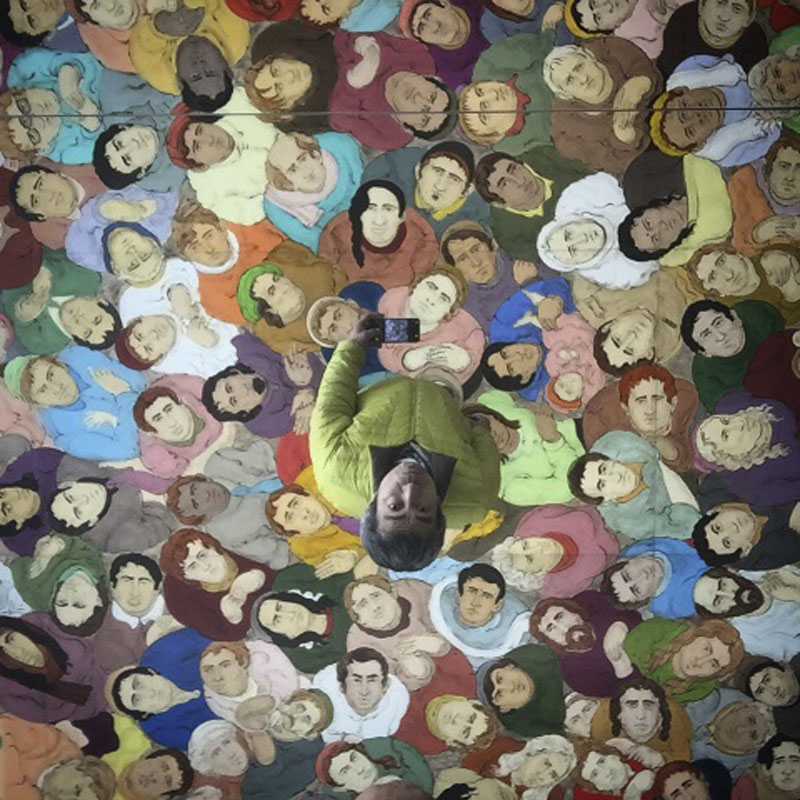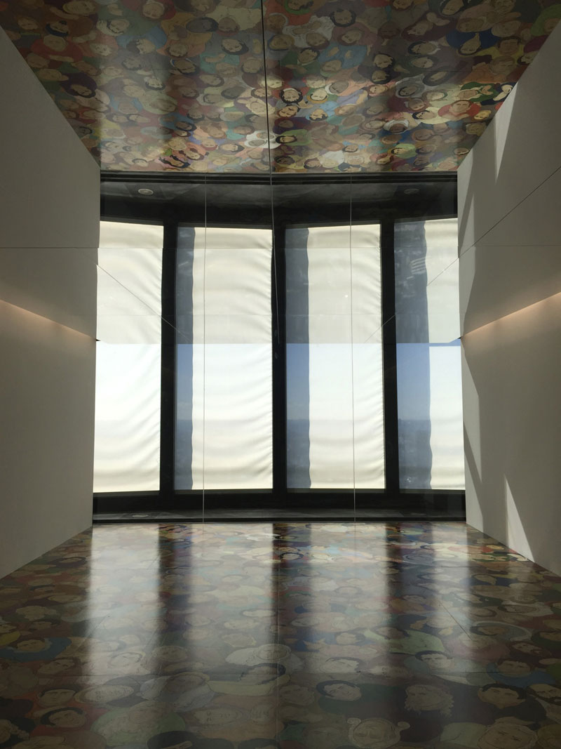 こんな作品があった。床に上を見上げる人々がびっしり描かれていて天井には鏡。