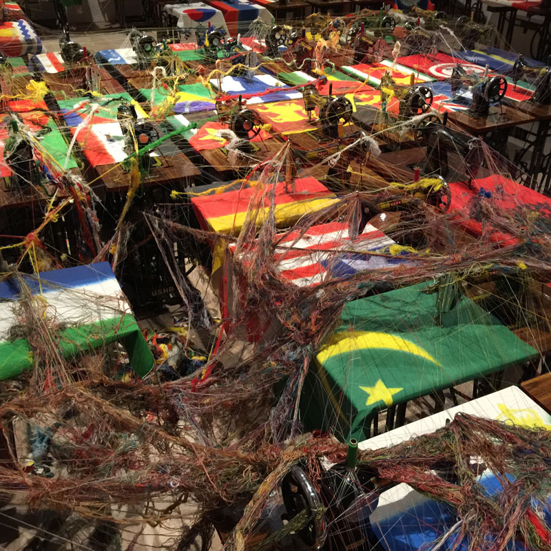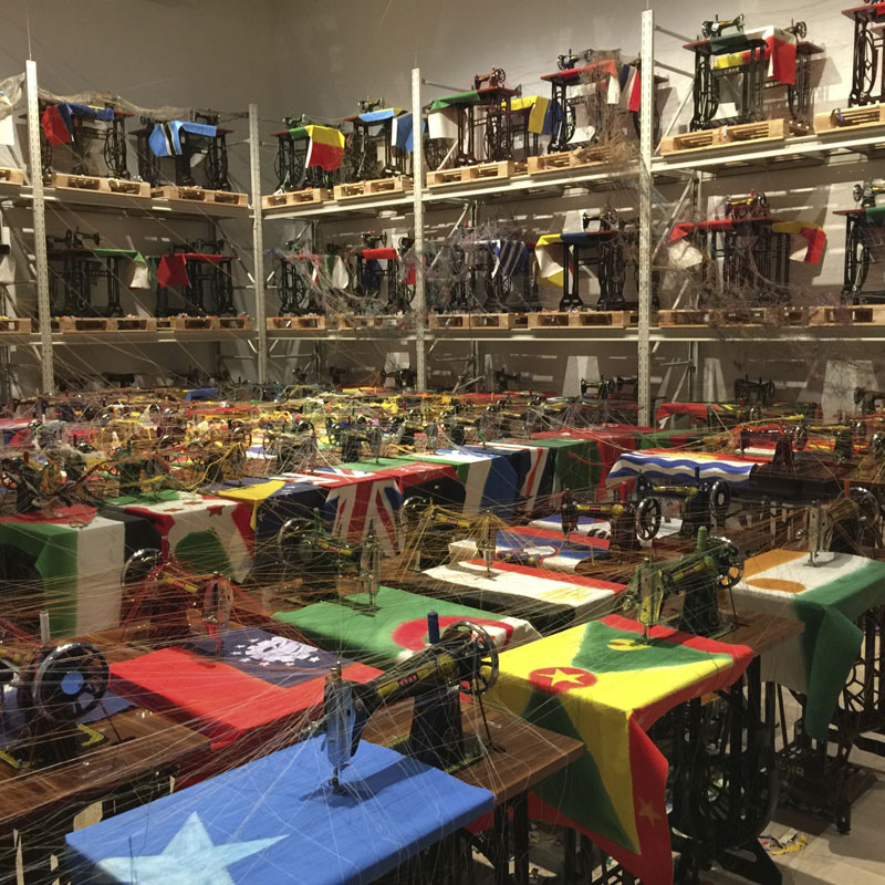 無数のミシンが糸で絡められている。床には裂けた国旗。