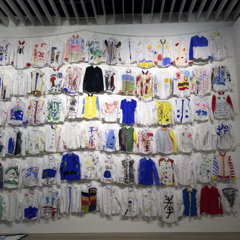 各地でその土地の子どもたちと数々のワークショップを行ってきたという作家が今回の個展に際し、森美術館近隣の小学校の生徒と一緒に行われた「どんな大人になりたいか」を想像してワイシャツに描くというワークショップ。小学生が何人か見に来ていたのは自分が描いたこれを見に来ていたのかな?
