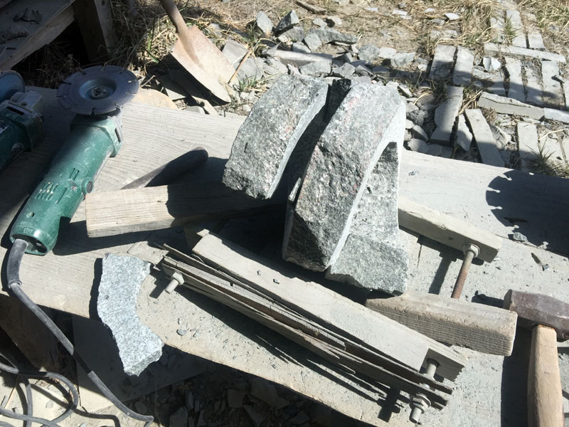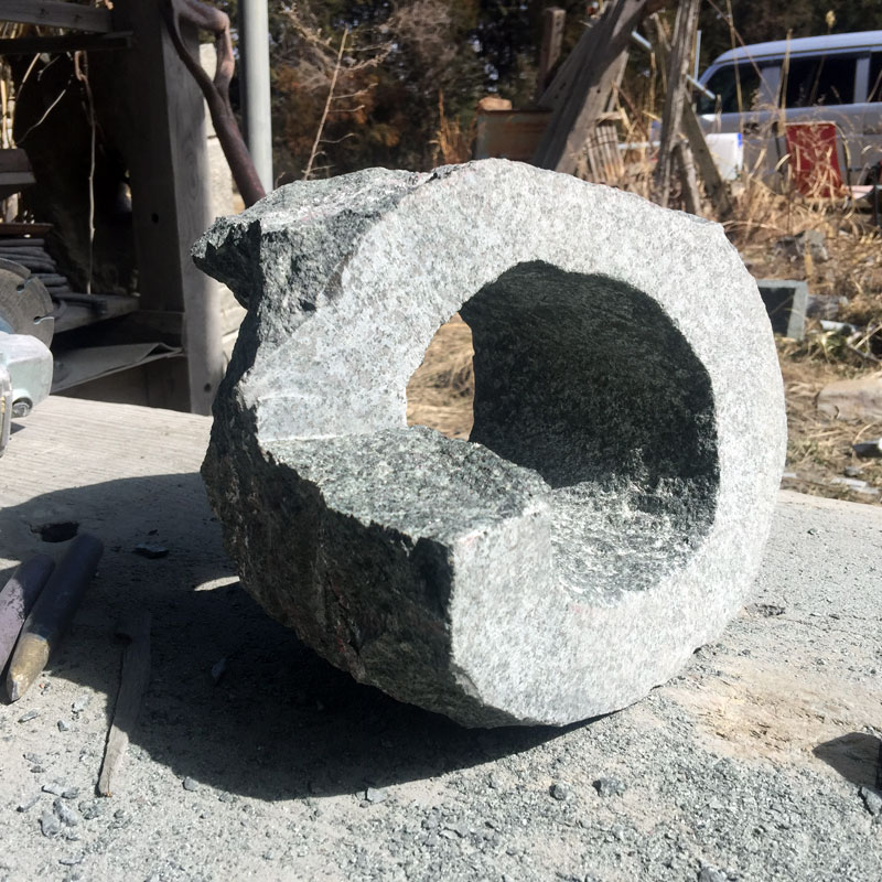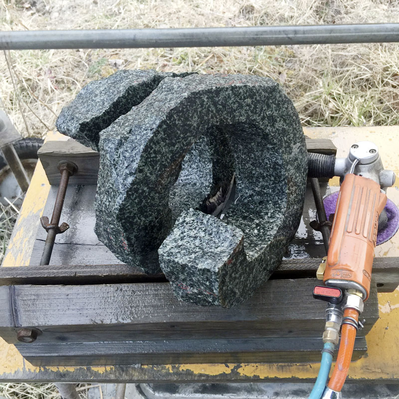 無事に螺旋を切り終わった。螺旋の形の石彫は螺旋切りが制作のひとつのピーク。