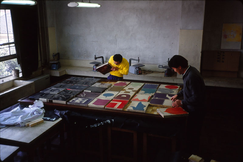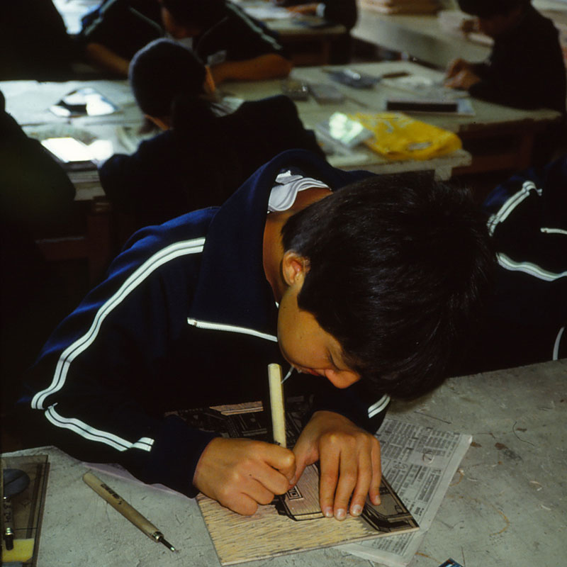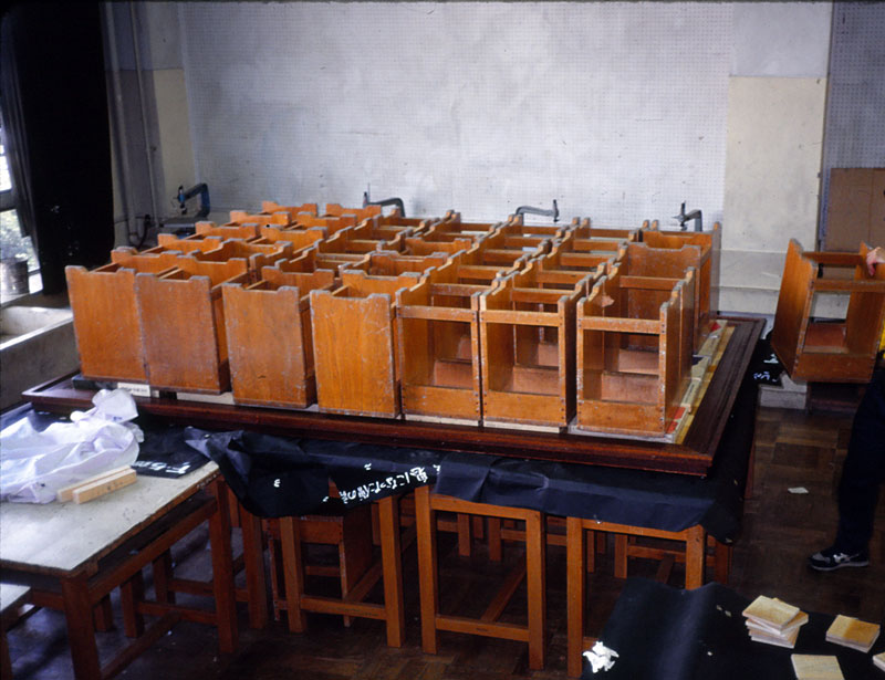 書道の師範の先生に文字を書いてもらい、文字のある部分も背景の部分も中心から放射状に彫り後が残るように、生徒全員ひとり1枚から2枚、先生方にも彫ってもらった。非力な子なんかは授業で木を彫らされて必死にがんばって、やっと卒業だと思ったら卒業制作にまた木を彫らされるなんて、と思った子も何人もいたはずだ。3年の担任に美術教師がいたという不運!ごめん、ご苦労さま、ありがとう。とにかく必要な枚数すべて彫り終わった。写真は同僚の教師や教材の業者の方にも手伝っていただいて、美術教室の大きな机を集め、その上に額縁を置いて、彫った木を並べて木工用ボンドで貼り付けたところ。湿気で木が反って固まってしまったら大変なことになるので重くて大きい美術全集をその上に置いて、