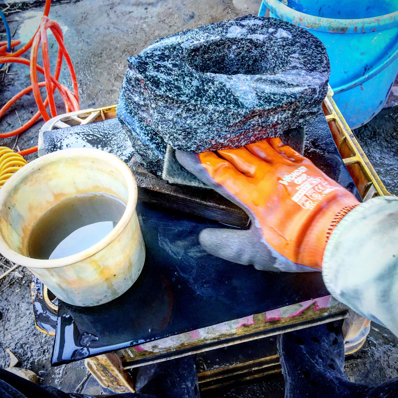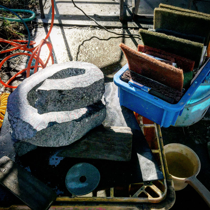 昨日、成形が終わった螺旋の石彫。機械で磨けないのでラジオを聴きながら手で水をかけながら磨いていく。