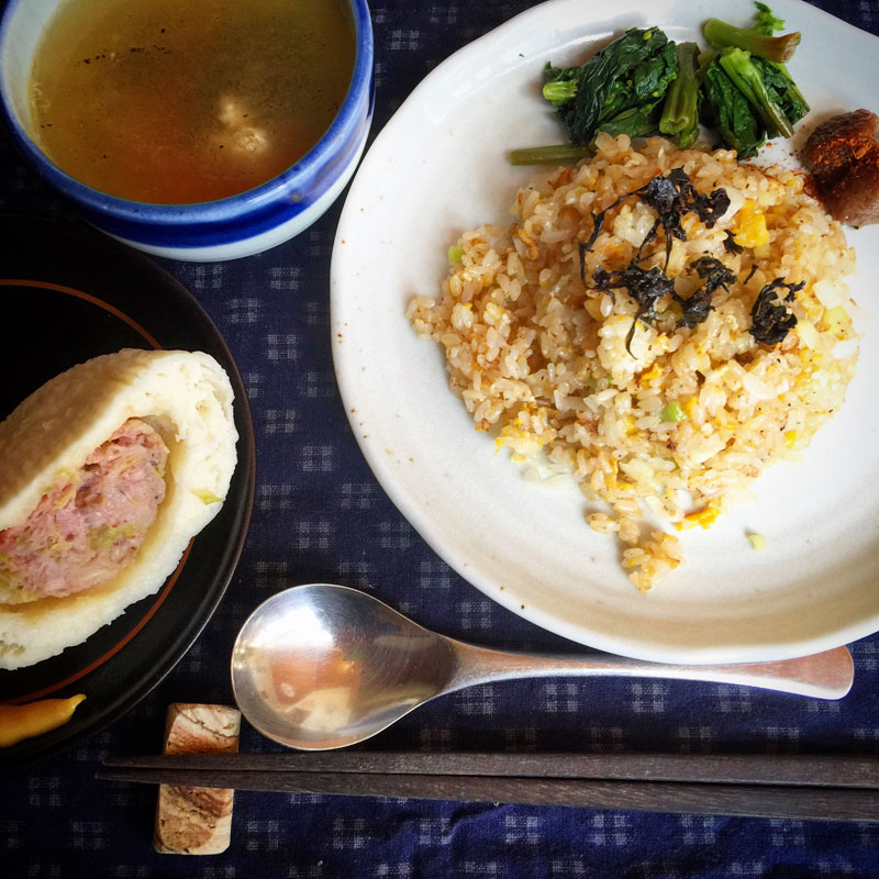 いつもの炒飯の昼食。九州の石屋さんからプレゼントされた天草木目石で作った箸置き、テストのつもりだったんだけど無垢の木のテーブルにもお似合いで、もはや自分専用のお気に入りの箸置きになってる。
