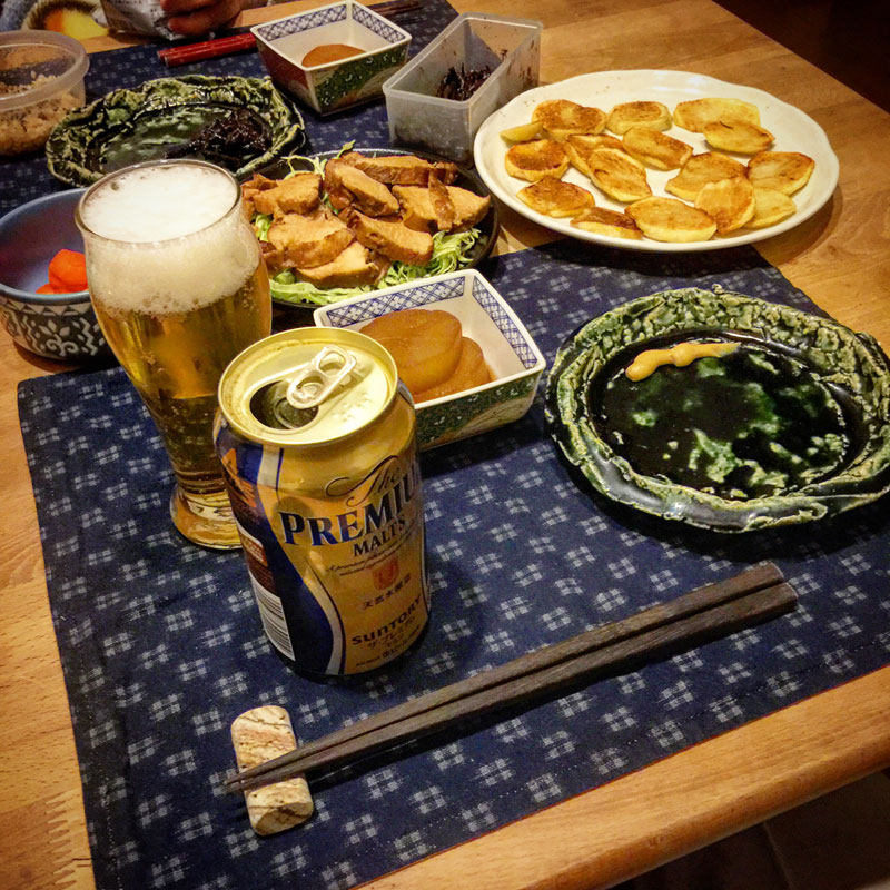 居酒屋我家。カミさんが土鍋で煮てくれた鶏、大根の煮物、オリーブオイルで低温でじっくり焼いたじゃがいも、@mari.shibata さんにいただいたビール(一杯目だけね。後は金麦)