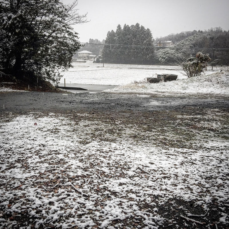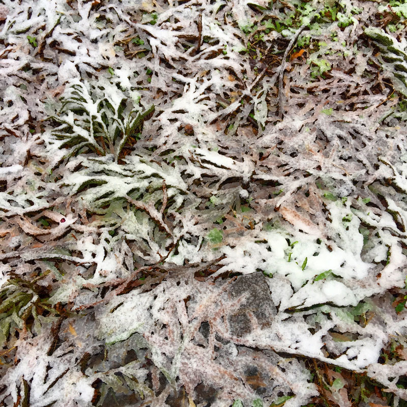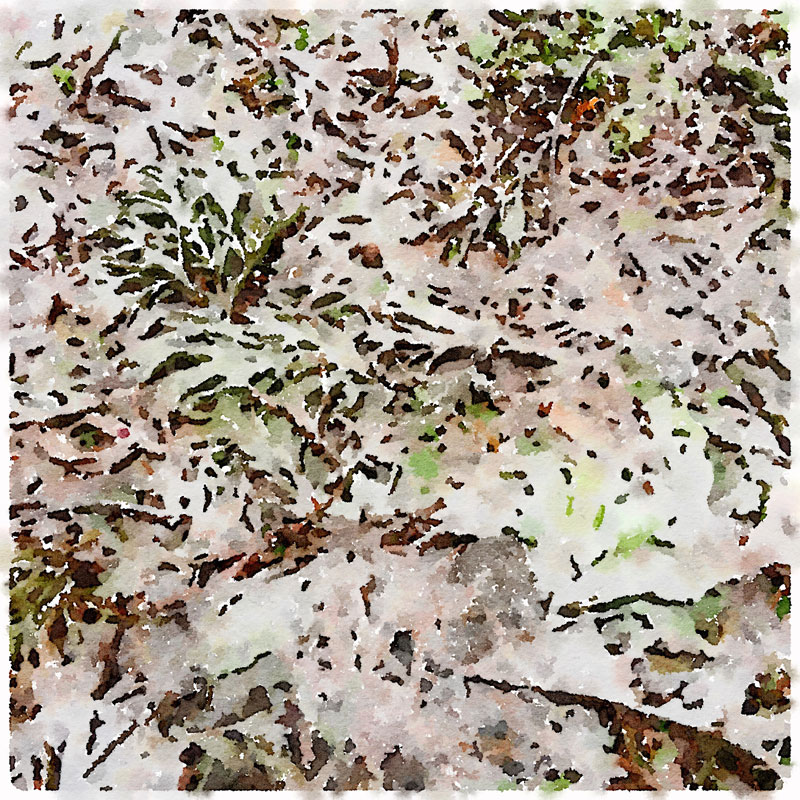 枯れた杉っ葉の上に乗るシャーベット状の雪のテクスチャが面白い。アプリで水彩画変換したみたいな景色が目の前に広がっていて。(変換してません)