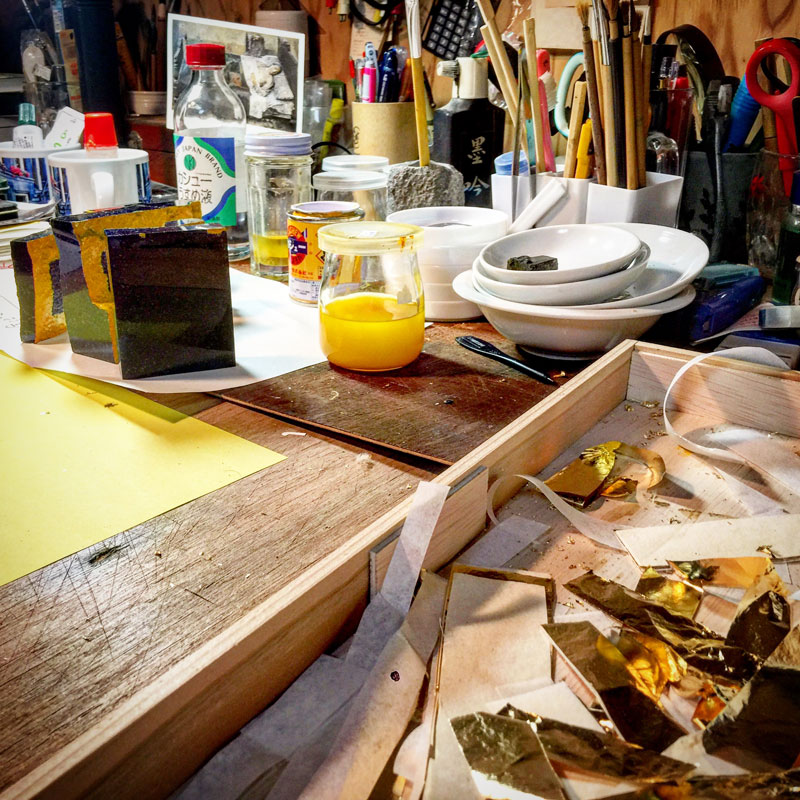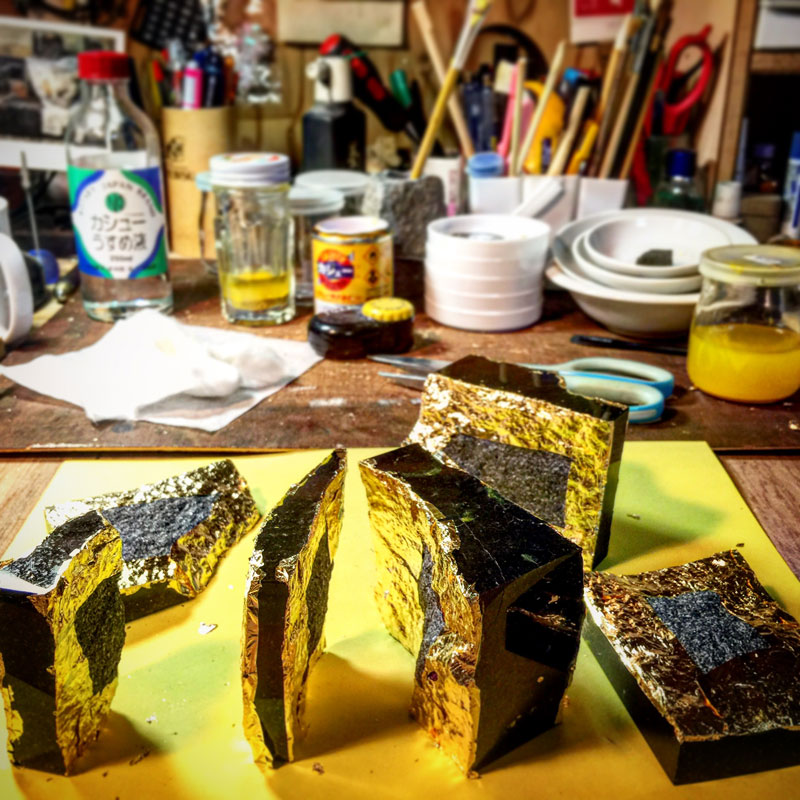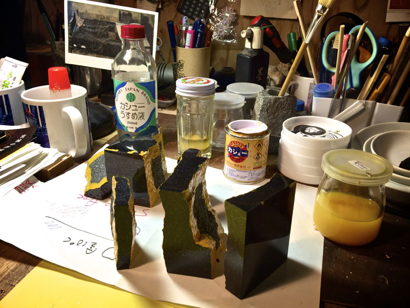 さっきの石が乾いたので人工漆を塗った。生乾きになったら箔を貼る。