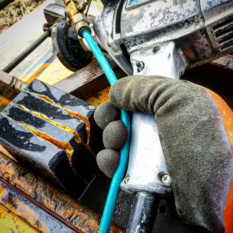 石は濡れた時の色が磨いた時の色。この黒御影石もまだ磨いてる途中だから、水をかけないと灰色。