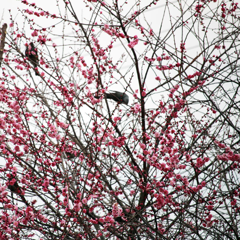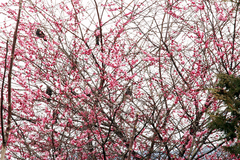 隣のモモの木にヒヨドリがたくさんとまっている。