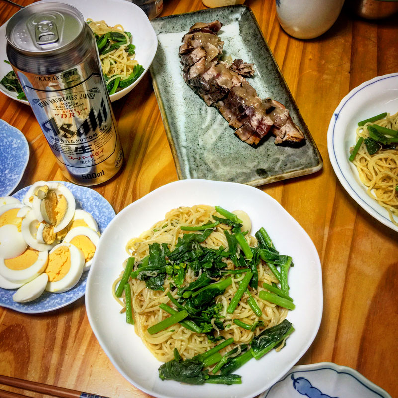 カミさんのお母さんが摘んだ菜の花と京都のちりめん山椒のパスタ、カツオのたたき。