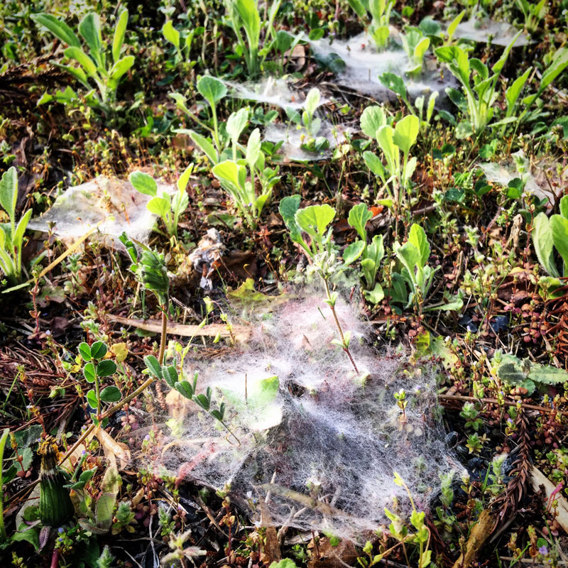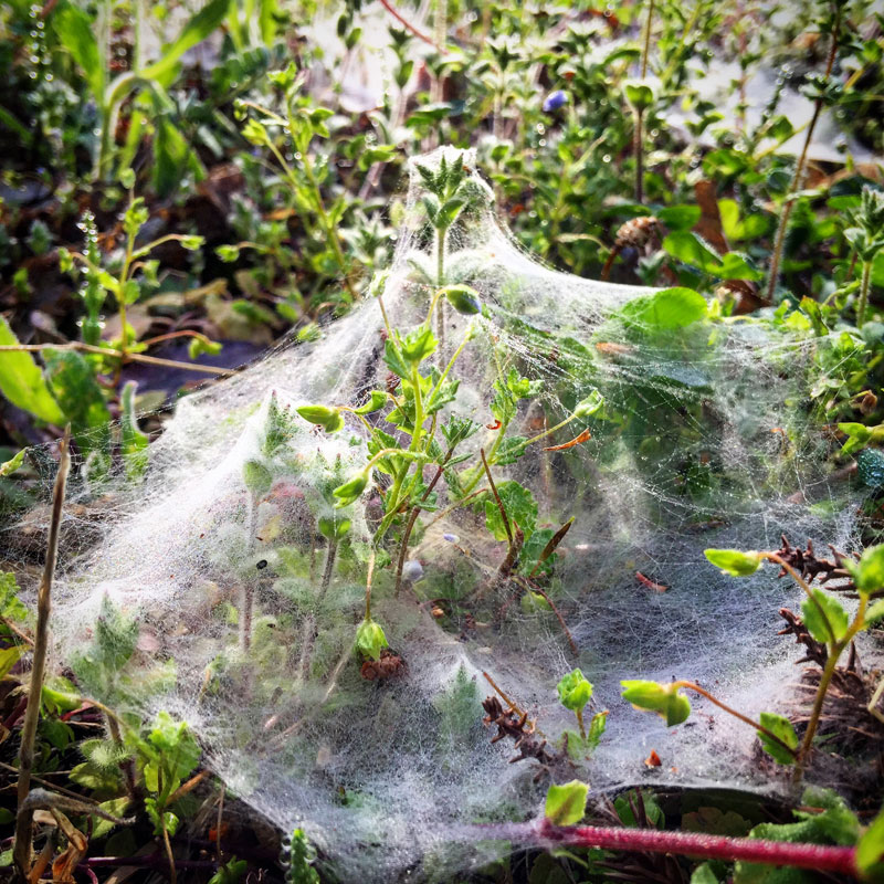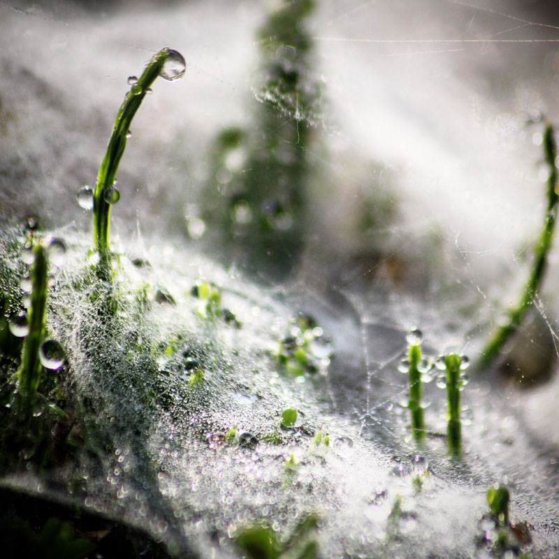 蜘蛛の巣とスギナと朝露。