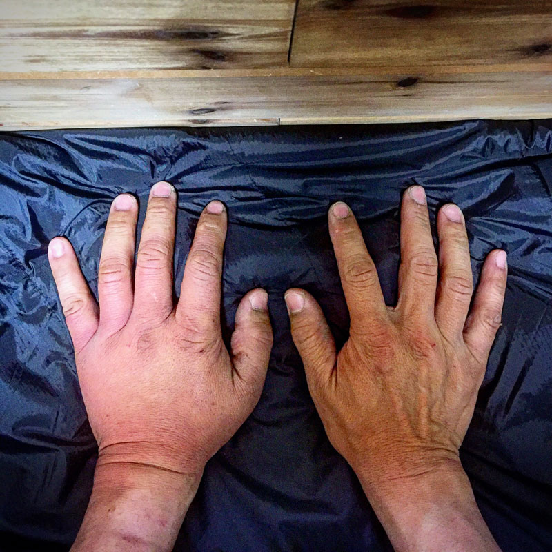 3日目の本日の左手。指の第一関節まで、うっ血が上がってきた。