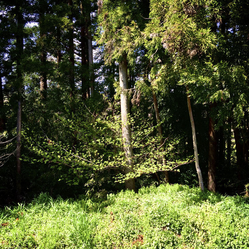 家の裏のお気に入りの木の若葉が毎日驚くほど大きくなる。その木の前に杉が一本生えているので、全体の形が見にくいんだけど。