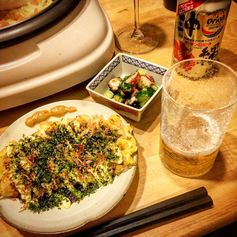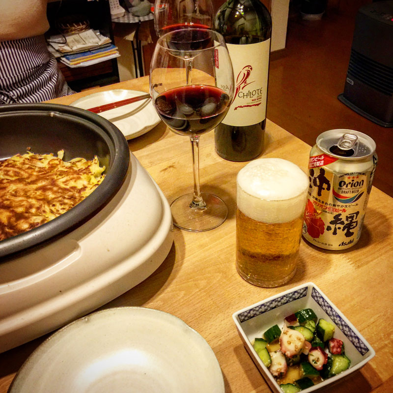 居酒屋我家。お好み焼き(府中焼き)タコときゅうりのシソ風味。沖縄のオリオン生ビールとチリの赤ワイン。