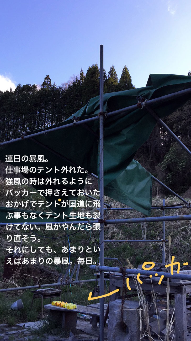 仕事場のテント。最近の天気予報の「この数十年で最大規模の暴風です」のたびに外しても全然風吹かなかったので、紐からパッカーで押さえることに変えていた。これなら強風、暴風の時に、パッカーが足場パイプとテント生地をとめるのが限界になって自動的に外れるのではないかと思った。