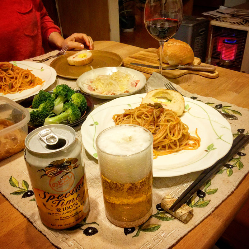 今宵、居酒屋我家開店。週末に開店するのになんで今日かと思ったら、長崎の鯛をとても小さなパックで売っていたからってカルパッチョにしてくれた。流れでトマトとオリーブのパスタ。地元の穴場の超美味しいパン屋さんのベーコンチーズ入りのバゲット。小さいから皮が多くなってバリバリで最高。旬のブロッコリーとCM に釣られた発泡酒、Special Time 美味しい。香る。