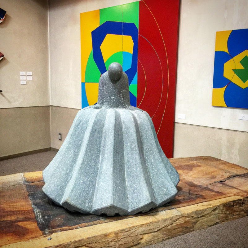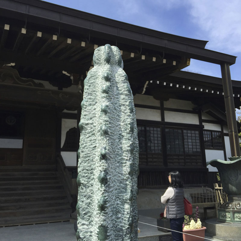 小林さんの作品。蛇紋岩の等身より少し高いくらいのサボテンのような作品。素晴らしい。石のいろ、磨き、個性的なノミ跡。奧には黒御影石の作品がふたつ見える。