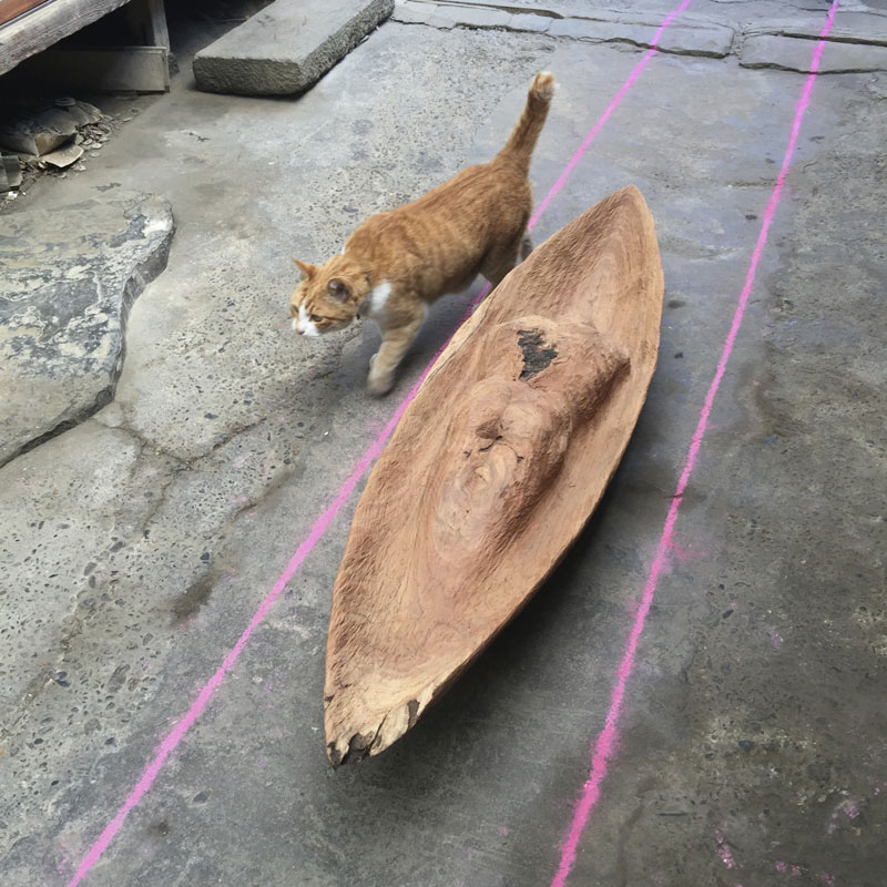アートさんぽのパンフレットの地図を見ながら幸手の町中を歩く。そして同じようにパンフを持ってキョロキョロ歩く人たちと何人もすれ違う。全部で19カ所にいろんなアート作品が展示されているという。金物屋さんに展示されていた、彫刻家 翁譲さんの木彫。