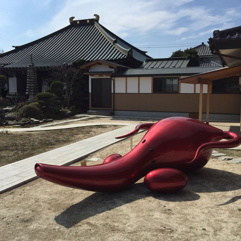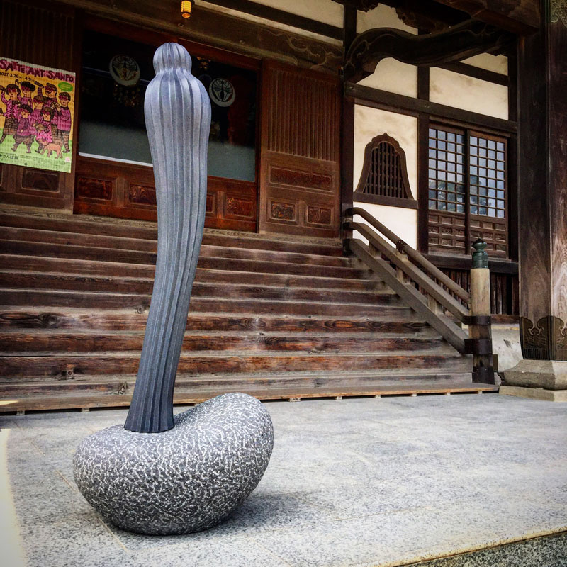 今回の一番の目的は小林さんの石彫を見る事。会場の聖福寺の横の幼稚園の門柱の上には像の石彫!なんで?面白いけど・笑