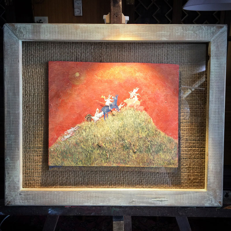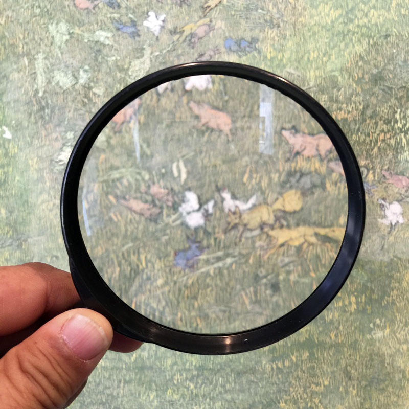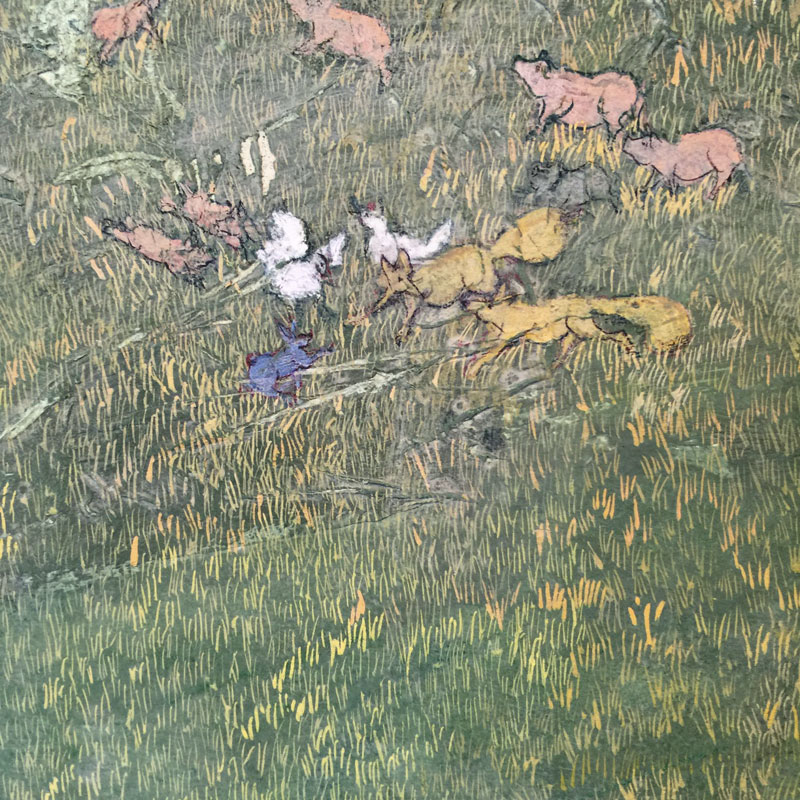大きな作品はたくさんの動物たちや草がていねいに描き込まれています。老眼な僕にも優しい拡大鏡が用意されていました。こんな作品展初めて!拡大鏡を使ってていねいに見たくなる作品。これはいいね!