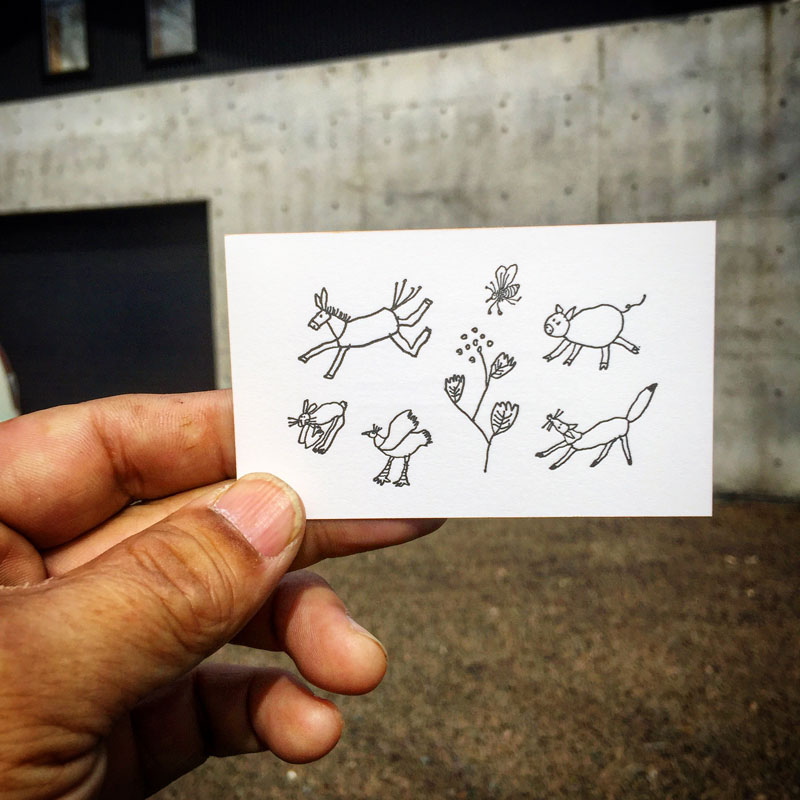 いただいた名刺は名前や連絡先の文字だけじゃなくて、手描きの絵まで良い紙にエンボス加工されている。触る幸せ。側面には(と言っても紙の厚さだけだけど)色まで塗られている。