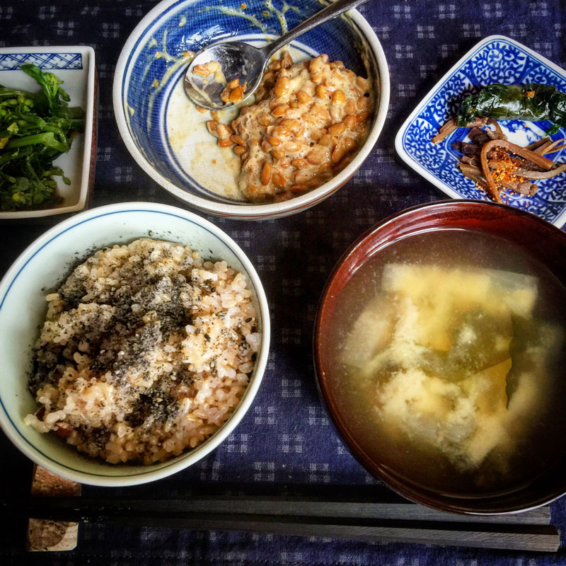 玄米の昼食。玄米には、ていねいに時間をかけて炒ってすった黒胡麻塩をかけないとね。