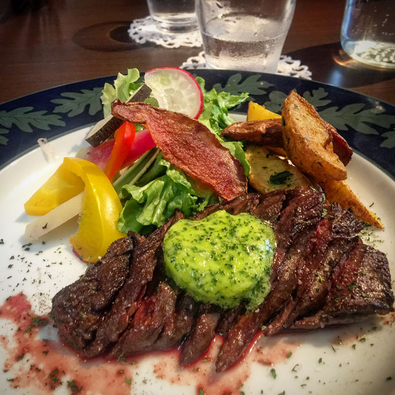僕はランチの定番、牛ハラミのステーキ、エスカルゴバターソース仕立て。