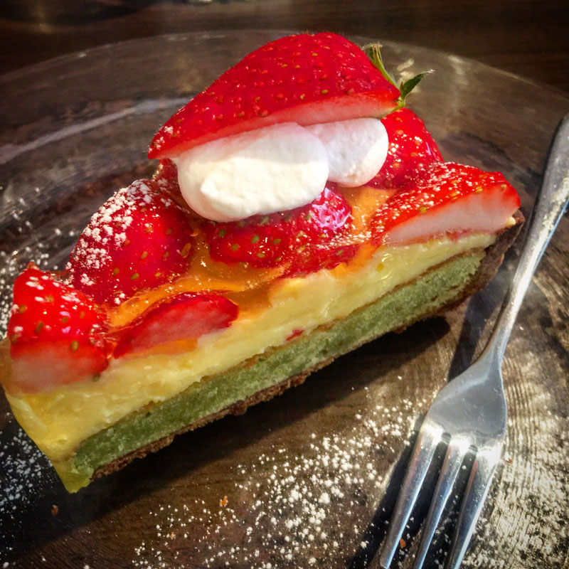 デザートの、タルト。苺、カスタードクリーム、ピスタチオのクリーム。タルト生地のサクリとした食感と濃厚な味でものすごく美味しかった!
