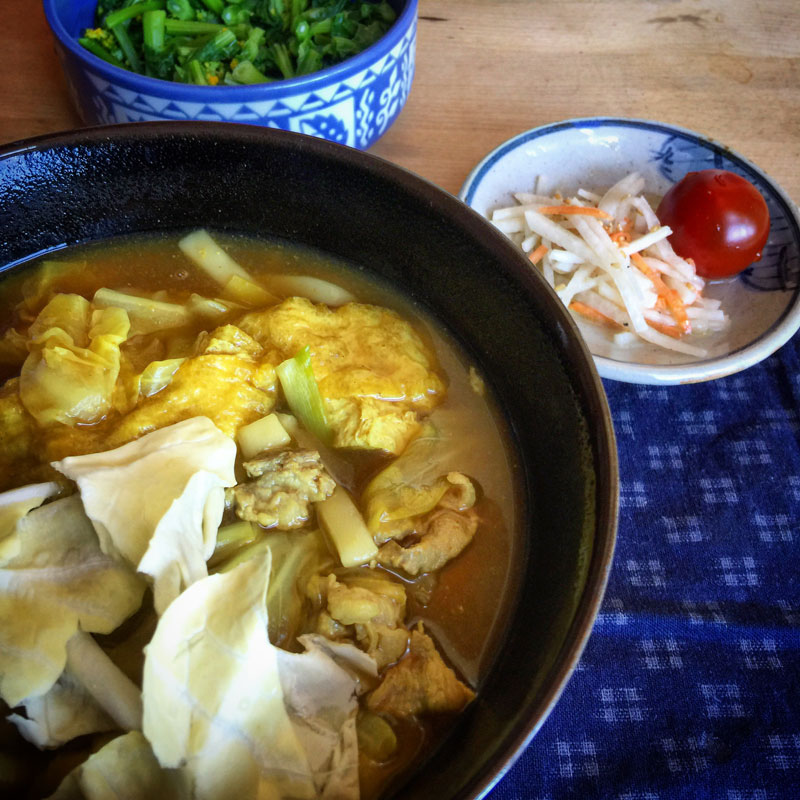 本日のランチ。カレーうどん、春キャベツ乗せ。いただいた白菜の菜の花、別の器に盛っていたけど、結局うどんにたくさん放り込んでいただきました。