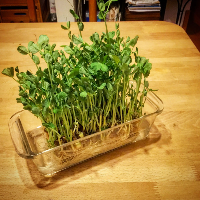 一週間前に食べて水栽培してた豆苗。今宵、俺に食べられちゃう前の最後の勇姿。もう一回水栽培しちゃうぞ。