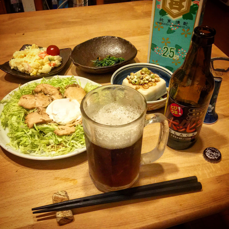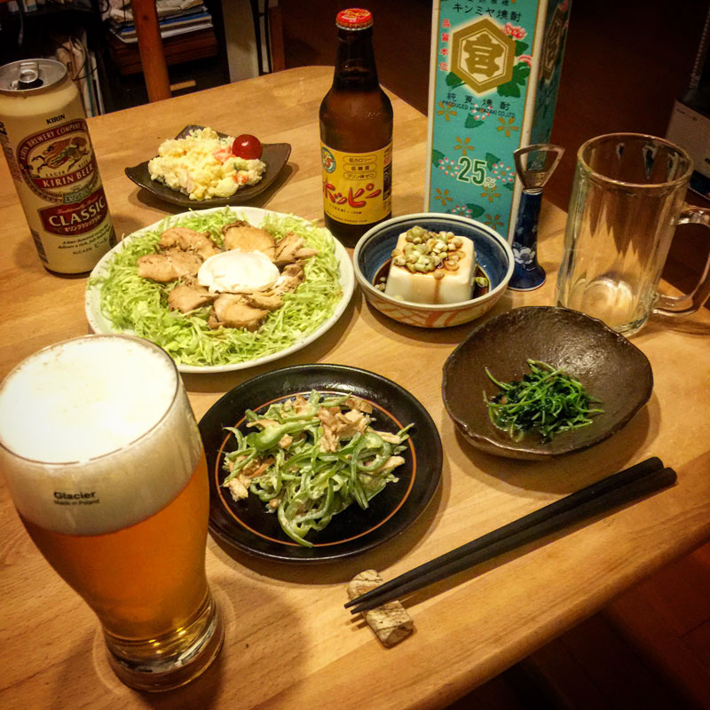 ひとり居酒屋我家。カミさんが作り置きしていってくれた鶏肉の土鍋煮を薄く切ってせん切りキャベツに乗せて煮汁をひと垂らし。「親子」的にポーチドエッグ作って真ん中に乗せたw いつもこればっかりなので、細切りにしてせん切りピーマンと和えてみた。マヨラー御用達のマヨネーズとその他調味料いろいろ。ごま油も。食べた後、一週間、水栽培した豆苗の炒め。来週も食べられるかなw ポテトサラダ。冷奴。しまった、少食なのに作りすぎた。全部食べるの無理。