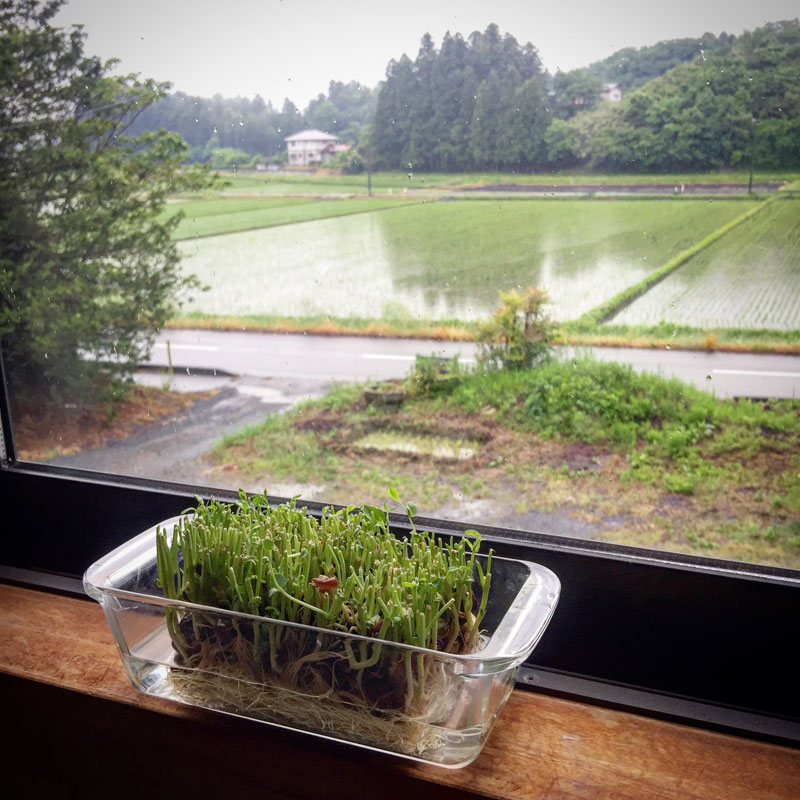 今朝の豆苗。(4回目)雨。ほとんど新しい葉が出てこない。太陽も出てこない。