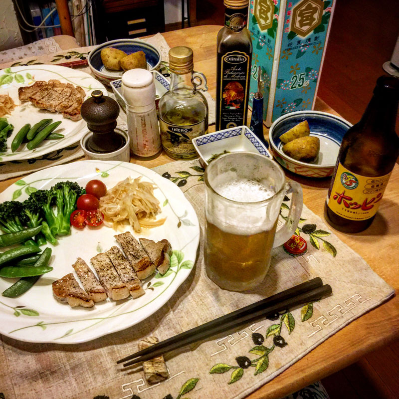 今宵、居酒屋我家、開店。ポークソテー。新玉ねぎと新じゃが。サヤエンドウ。昨日、落し蓋してきっちり時間計って茹でて、湯切りして、うちわであおいで急冷して冷蔵庫に入れておいたブロッコリー。野菜が肉を引き立ててるのか、肉が旬の野菜を引き立ててるのかわからないくらい、旬の野菜は美味しい。甘い。ひとつめは、塩もマヨも無しでいただきます。うまー!
