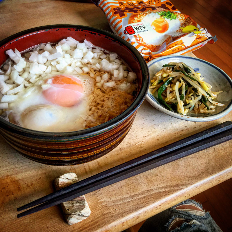 箱買いした金麦におまけで付いてたチキンラーメン昼食に食べる。長ネギを切らしていたので、八王子ラーメンの様に新玉ねぎをみじん切りにして入れた。
