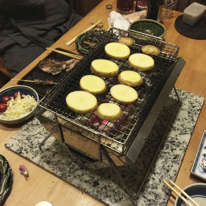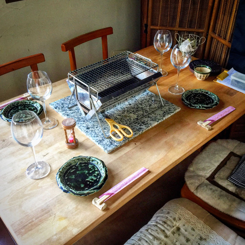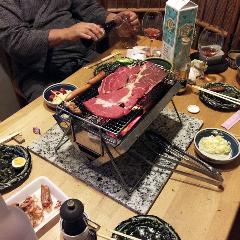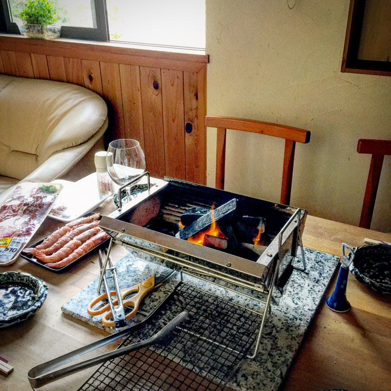 今夜の酒宴はまた焼き物にする。セラミックで断熱が効いてるからそんなに熱くないし、何よりビールがうまい!