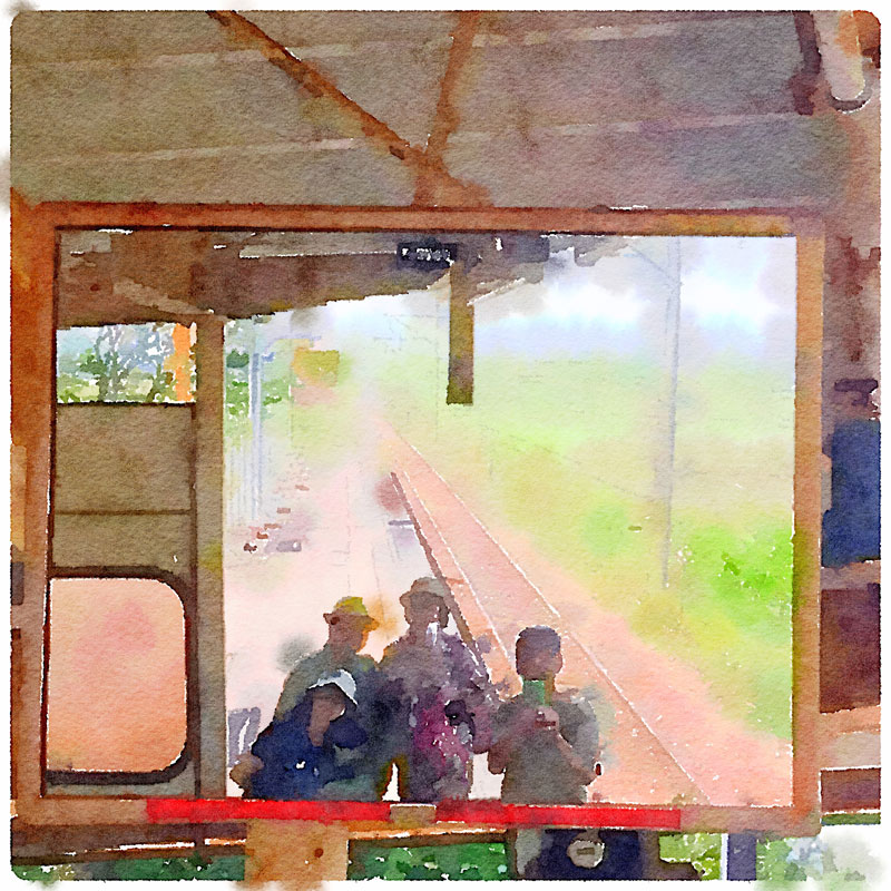 ユニック車をプレゼントしに来てくれた鳴海くん夫婦を家から一番近い、単線の無人駅のホームまで送る。ワンマンの運転手さんが安全確認に使うのであろう、ホームの大きなミラーを使って記念写真。