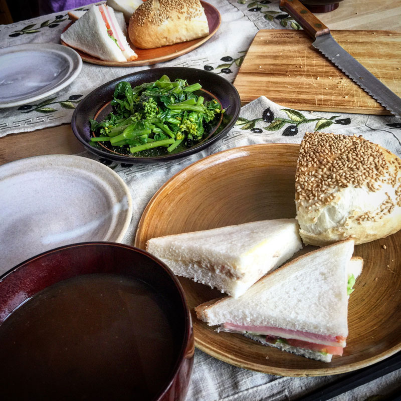 パンは大好きなんだけど、普段は食べないことにしてる。久しぶりのパンのランチ with なめこの赤出し味噌汁。ごぼうサラダをはさんだフランスパンが美味しい。