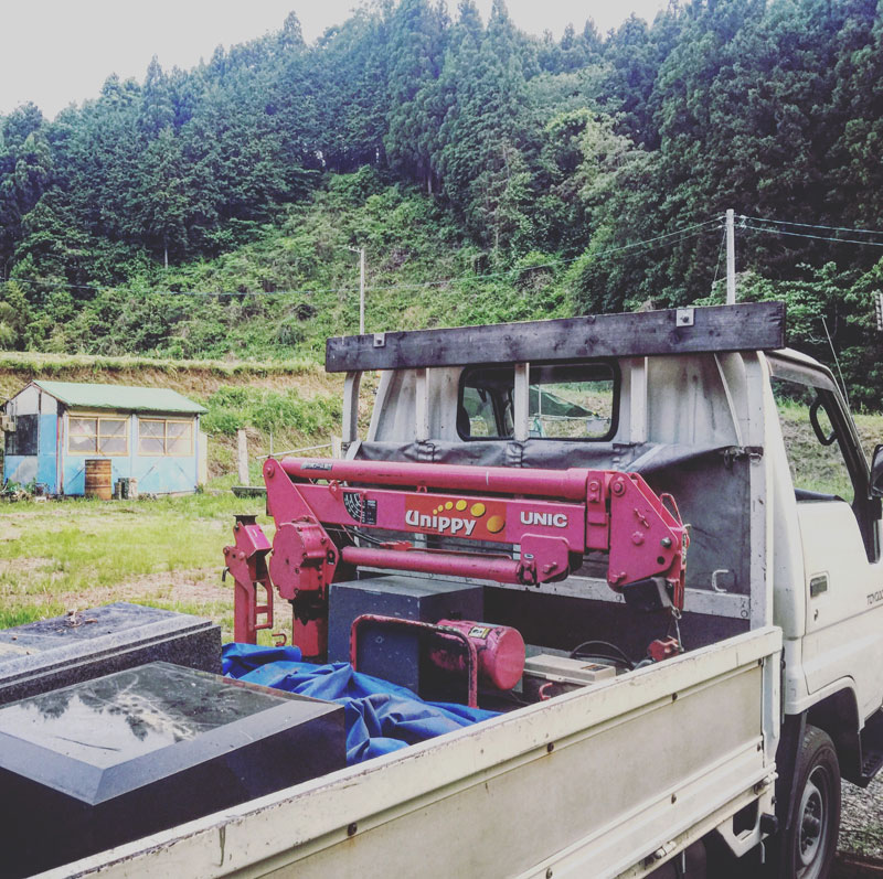市内でユニック車の盗難が相次いでいるというので、簡単には盗まれないように石をふたつ荷台に積んだ。本気で盗みに来るなら防げないけど少しでも時間稼ぎできるように。