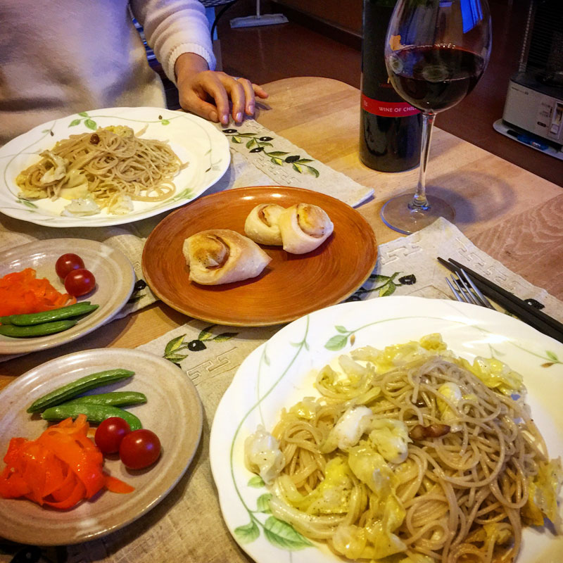 居酒屋我家、今宵開店。瓶詰めのアンチョビと部落の高橋さんにいただいた春キャベツで、僕が風呂に入っている間にカミさんが作ってくれたパスタ。高橋さんのキャベツが美味しすぎ。いただいた時に極細の千切りにして食べてうっとり。今度、作り方の秘訣教えてもらおう。赤ワインとベーコンエピ。
