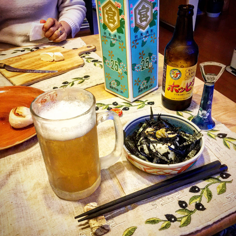 赤ワインからホッピーと海苔ワサビの枝豆豆腐に切り替えて、居酒屋モード。冷奴は海苔わさびがうまい。美味しい豆腐は海苔とわさびで食え!て言ってた、青森のざる豆腐屋さんの言う通り。