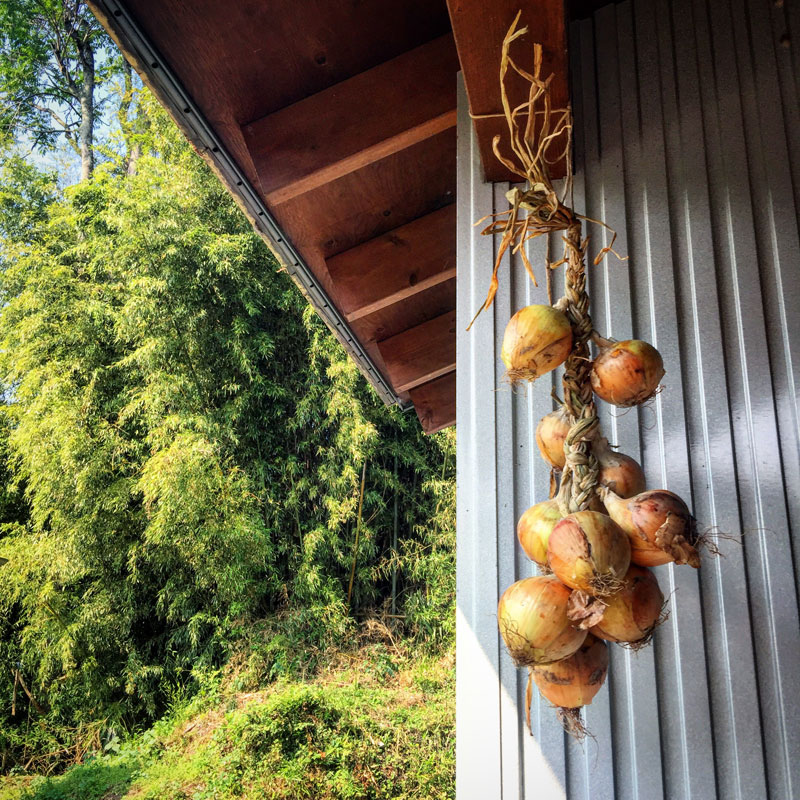 部落の方にいただいた玉ねぎ。三つ編みにして軒先に吊るした。