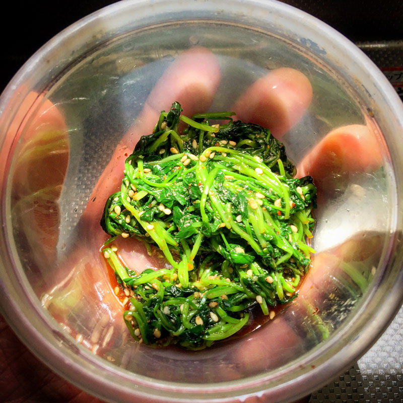 1回目を食べた豆苗は6日目の今日の昼、ナムルに料理しました。夕飯の頃には味がしみて美味しくなってるでしょう。