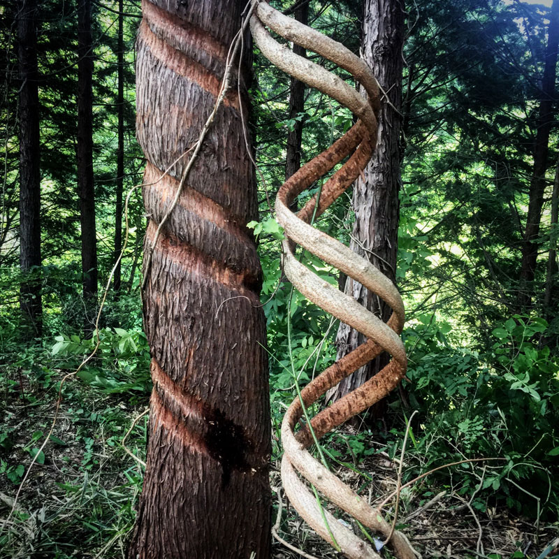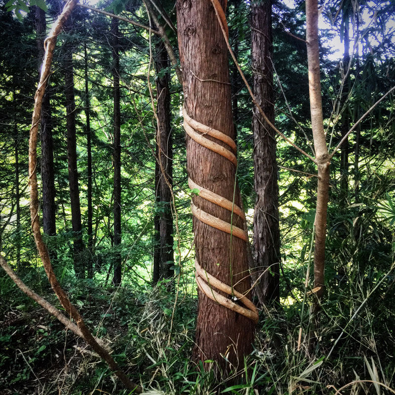 杉の木を植林した、今は亡き仕事場の大家さんの親父さんに敬意を表して、がんじがらめの杉の木に巻きついていた葛を切る。葛ごめん、完璧な二重螺旋だ。僕の制作のモチーフだ・笑