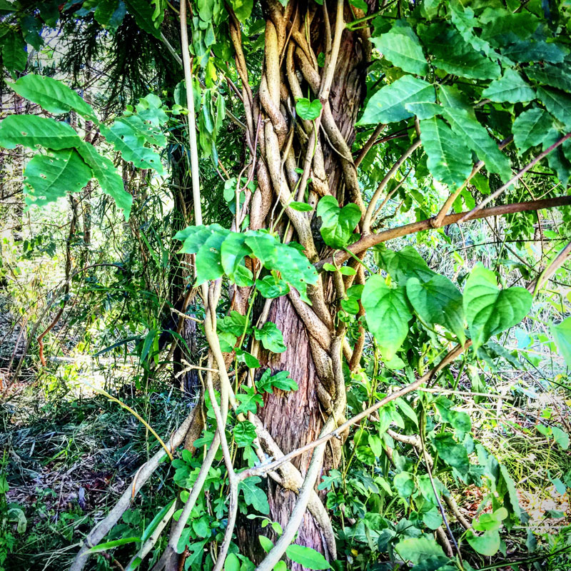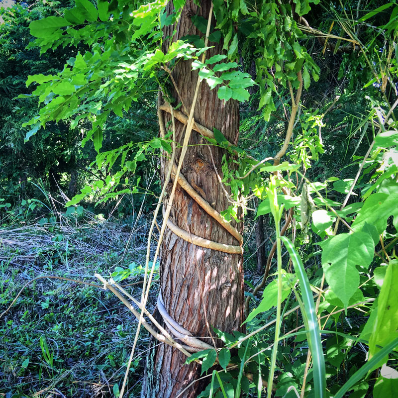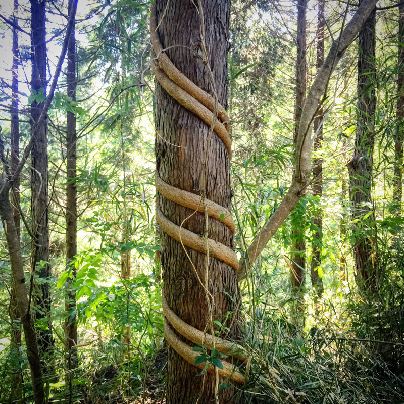 葛が大蛇のように杉の木に巻き付いてる。こんなに太くなるのか。 #tree #arrowroot #葛