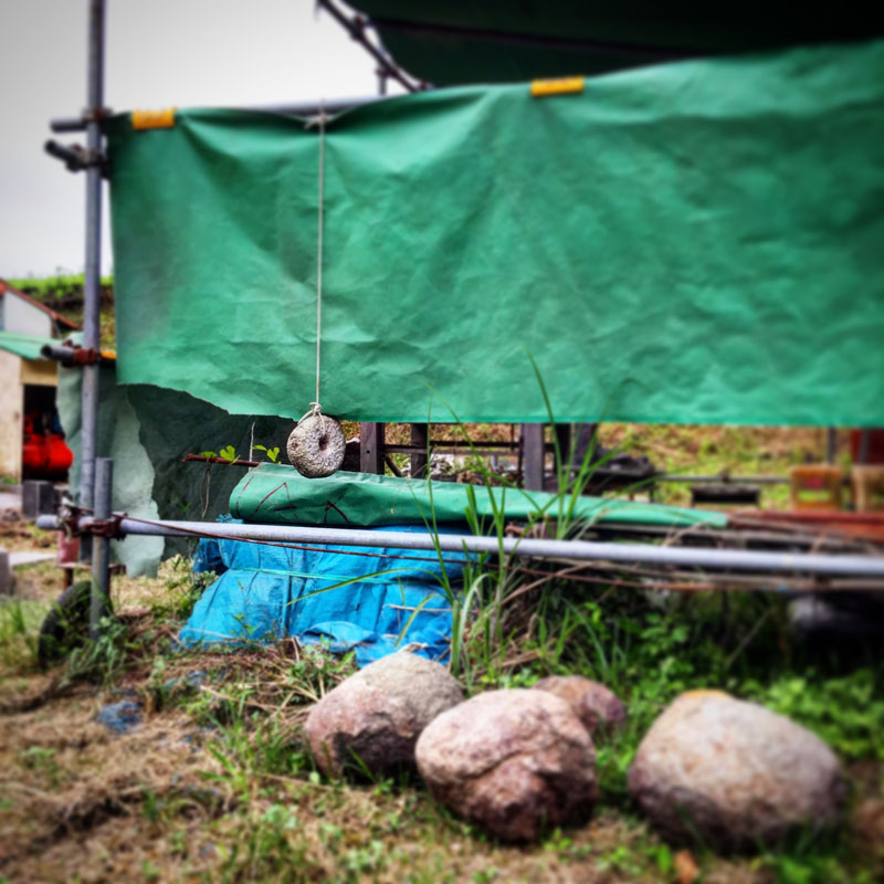 吊られた白御影石のドーナツw(目隠しのシートのめくれ止め)