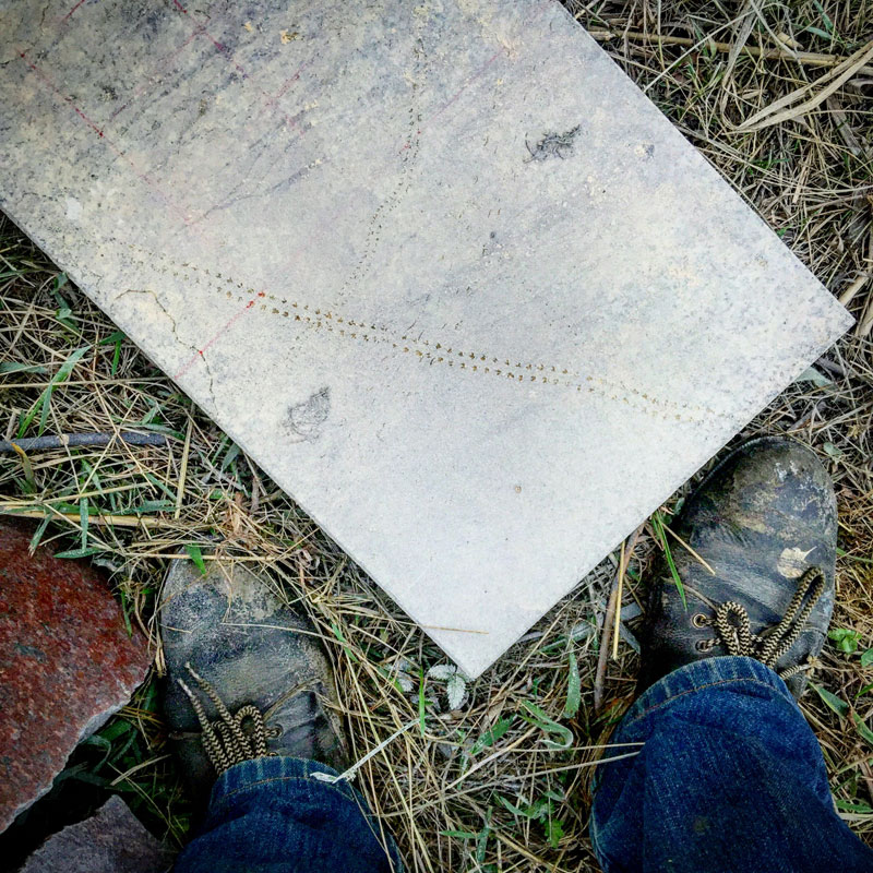 制作中の粉だらけの白御影石の上を何者かが歩いた跡。ずいぶん綺麗な足跡だこと。虫。。だよなぁ。。。?