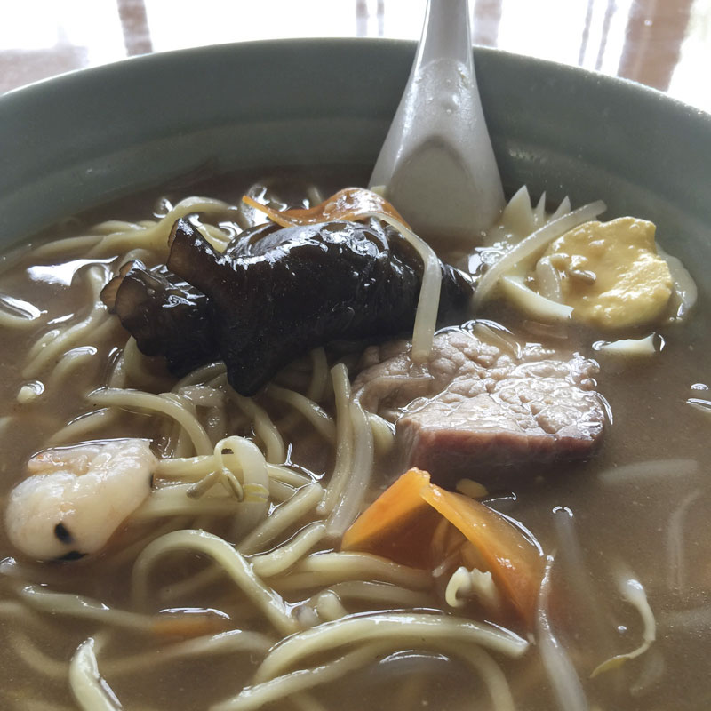 もやしを始めとして沢山の野菜、エビ、しいたけ、ゆで卵、きくらげに分厚いチャーシュー(いつものラーメンのとは違う)。角田ブラック(ラーメン)はいつもスープまで完食だけど、スープ残した、無念。