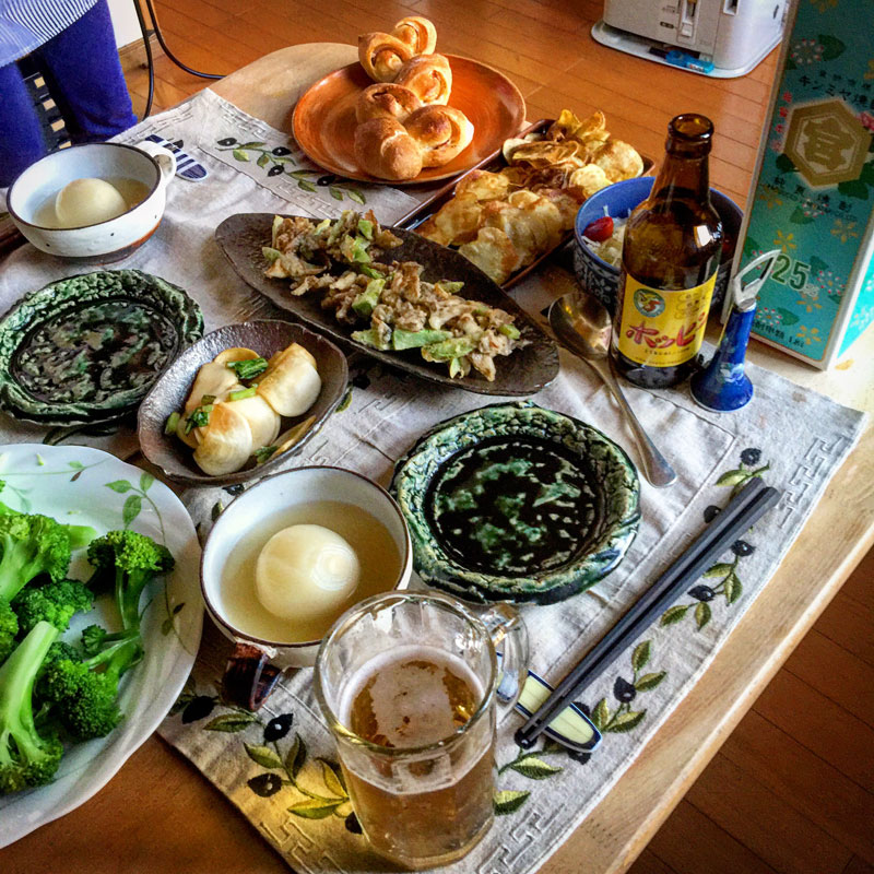 居酒屋我家、開店。昨日、部落の方にいただいた新玉ねぎの小玉ねぎでスープまた作った。ポテトチップスも。