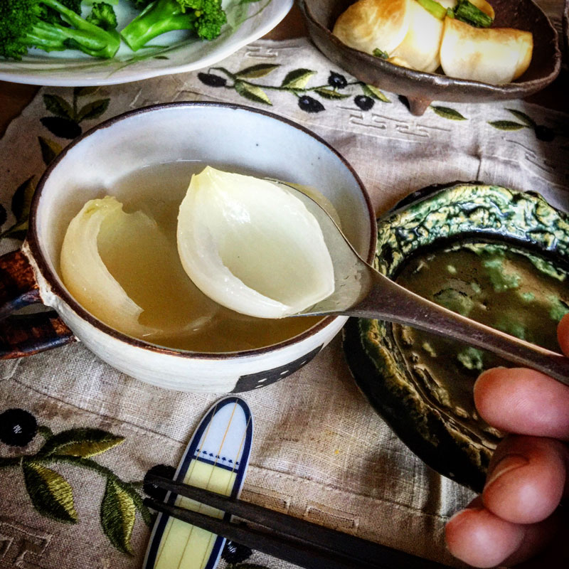 新玉ねぎの小玉ねぎのスープ。コンソメスープに昆布と梅干しの種と塩。ひとふさ々々すくって食べると旬の玉ねぎの甘さがほろり。