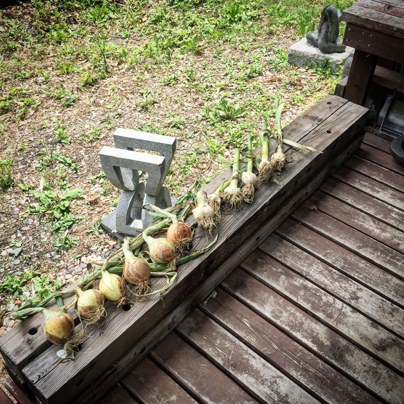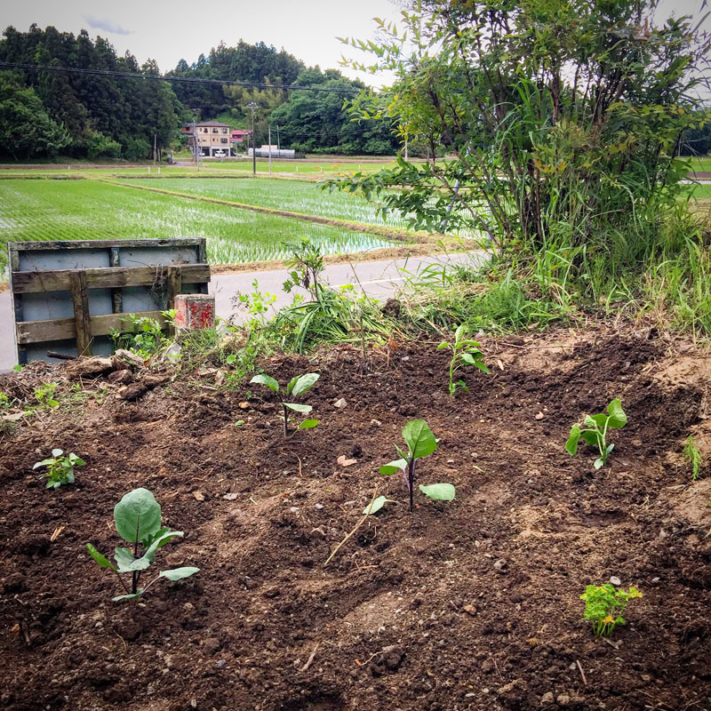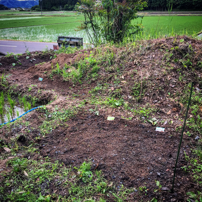 庭の一畳田んぼの脇の葉物エリアには、バジルとルッコラを半分ずつ撒いた。原発事故の年に植えようと思っていた6年前の種だから発芽しないかもしれないけど。