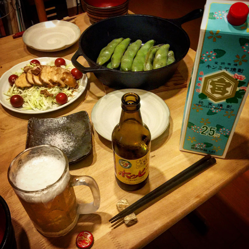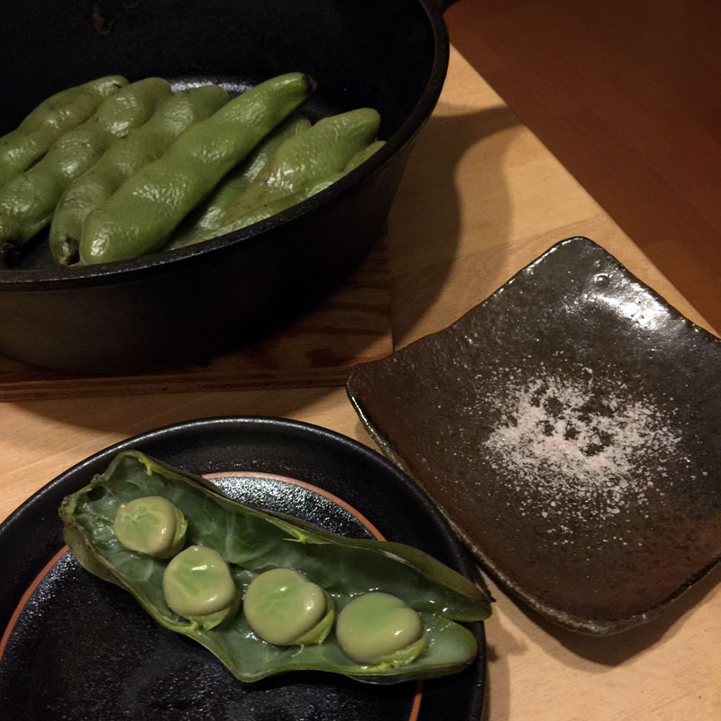 居酒屋我家、開店。ダッチオーブンで蒸したソラマメがトロトロ。ちょっと柔らかすぎるくらい。
